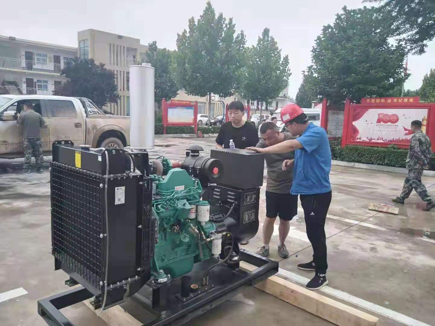 天災何所懼,風雨見真情。汛情發生后,公司專門成立應急保障隊,根據防汛需要,將公司生產的多種發電機組產品送抵各重災區,保障現場用電,為陰云籠罩的災區人民送去光明和希望。市場部宋志亮、喬文龍連夜裝車,把1臺75kW靜音發電機組送到鞏義米河鎮并留守保障;李斌、李亞、雷咸穩及時把1臺50kW靜音發電機組送到東區華為科技城并留守保障;為滎陽市汜水鎮政府運送2臺15kW發電機組、為滎陽市喬樓鎮運送1臺30kW發電機組、1臺120kW發電機組用于救災。在大戰大考中,踐行初心使命,彰顯國企擔當。